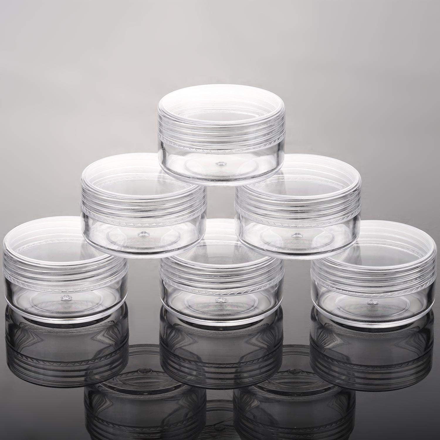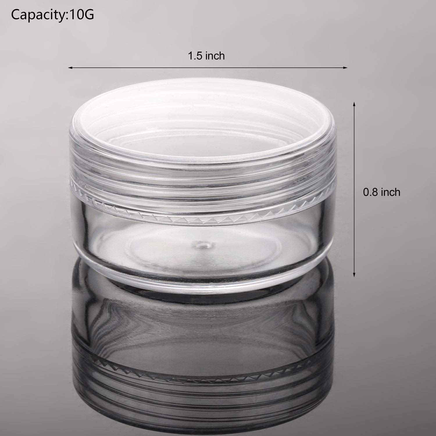 Quantity: 100 pieces of plastic jars with lids; Capacity: 10g/ 0.34oz. Perfect for storing lotions, lip balms, toners, creams, acrylic powder, and other beauty aids