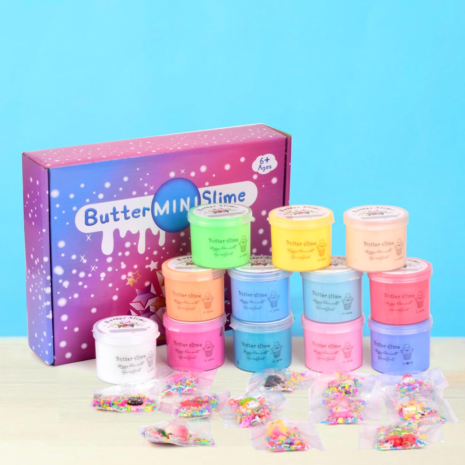 ★Slime kits: 12 pack mini butter slime set with 12 diffrent colcors(60ML*12), come with Ice cream, pineapple, cherry, candy, watermelon, ice cream, mermaid, heart-shaped cake, ice cream, peach and some chocolate crumbles.