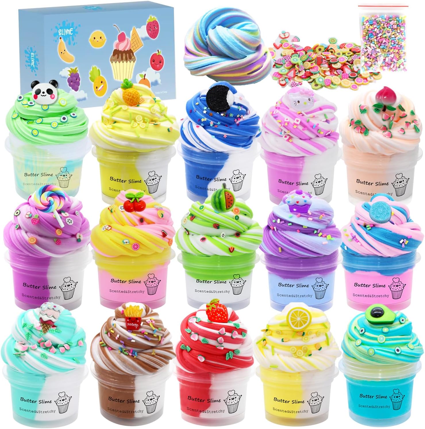 15 Pack Dual Color Slime Toy – Butter Slime with Cake Charms Included,Super Soft & Non-Sticky,Educational Stress Relief Toy,Birthday Gifts for Girl and Boys.