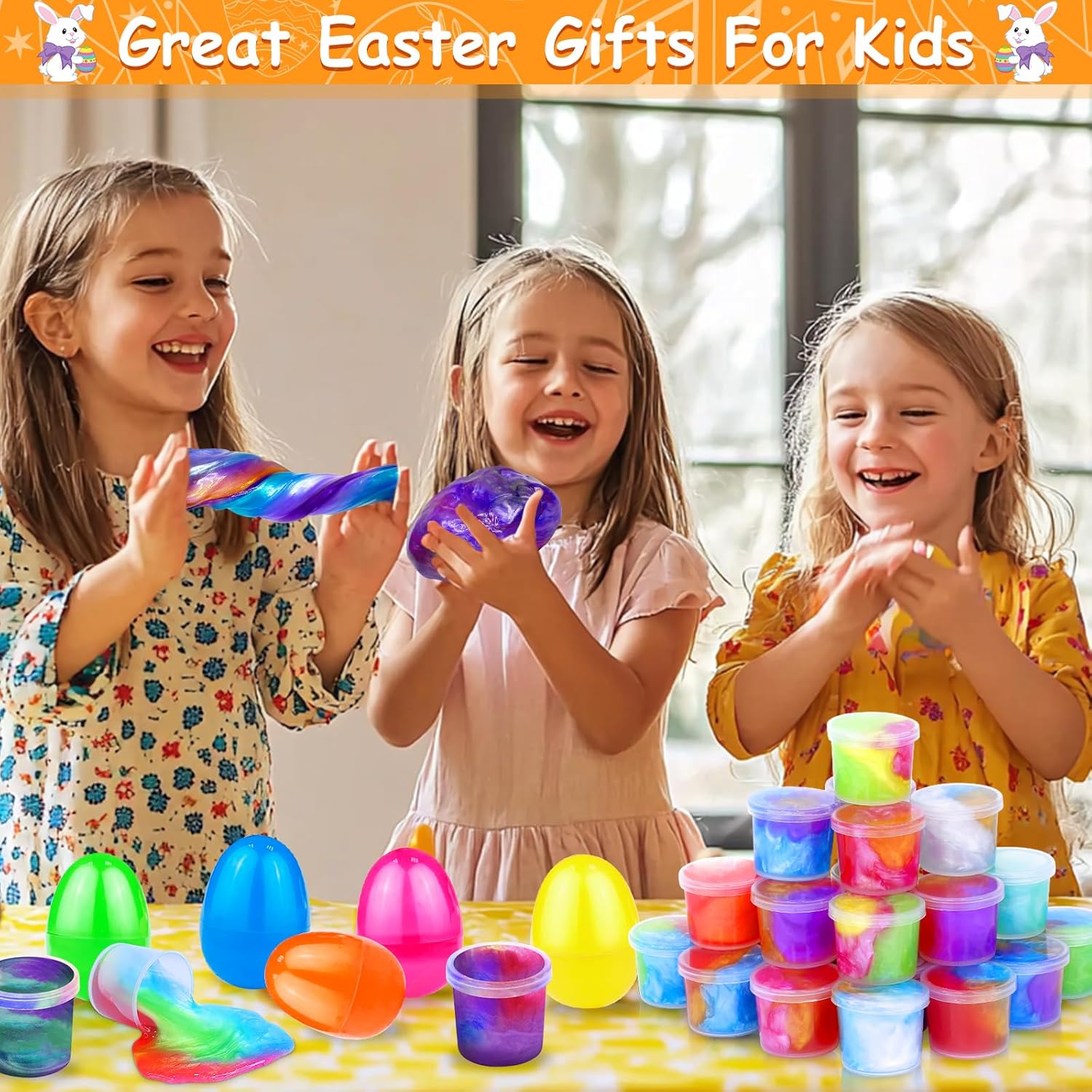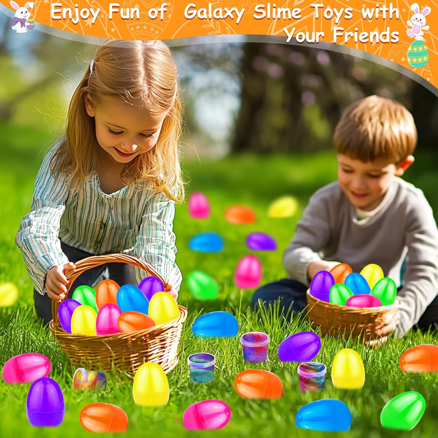 24 Prefilled Easter Eggs with Galaxy Slime Cups: Includes 24 colorful Easter eggs in 6 vibrant colors, each filled with 24 galaxy slime cups in 6 colors. Each slime is prefilled inside the eggs, ready for instant fun.