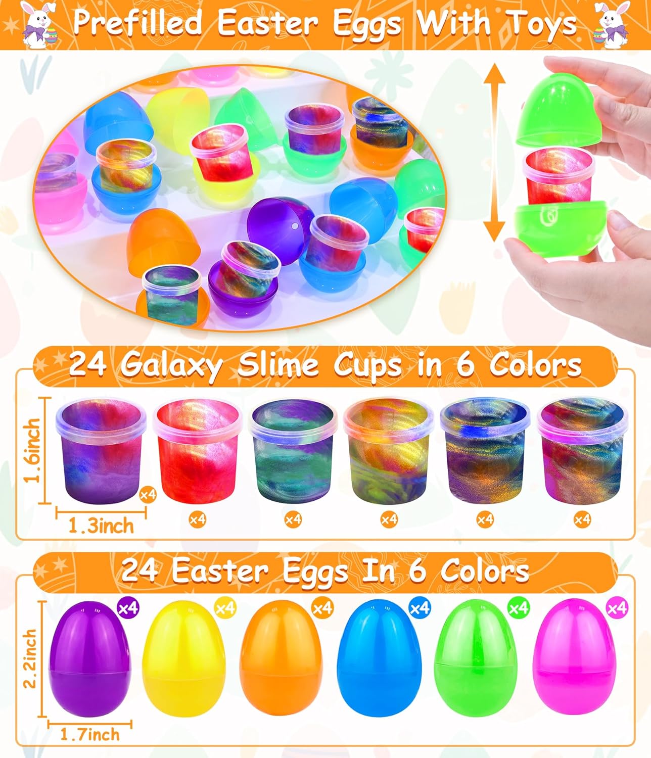 24 Pack Prefilled Easter Eggs Stuffers with Galaxy Slime Stress Relief Toys Easter Basket Essentials Surprise Fillers Stretchy Fidget Putty Classroom Reward Hunt Party Favors Kids Toddlers Gifts Prize