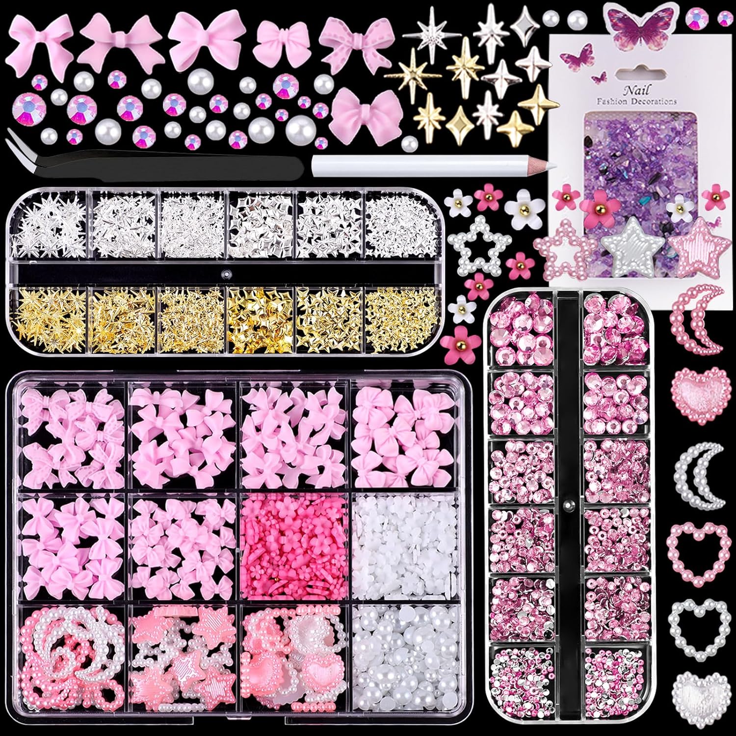 3D Nail Charms, Mixed Flower Bow Moon Heart Star Nail Art Charms Nail Rhinestones,Half Round Pearl+Flatback Pink Gems+Gravel Diamond+Nail Studs, Nail Gems for Nail Art DIY Decoration with Pickup Tools