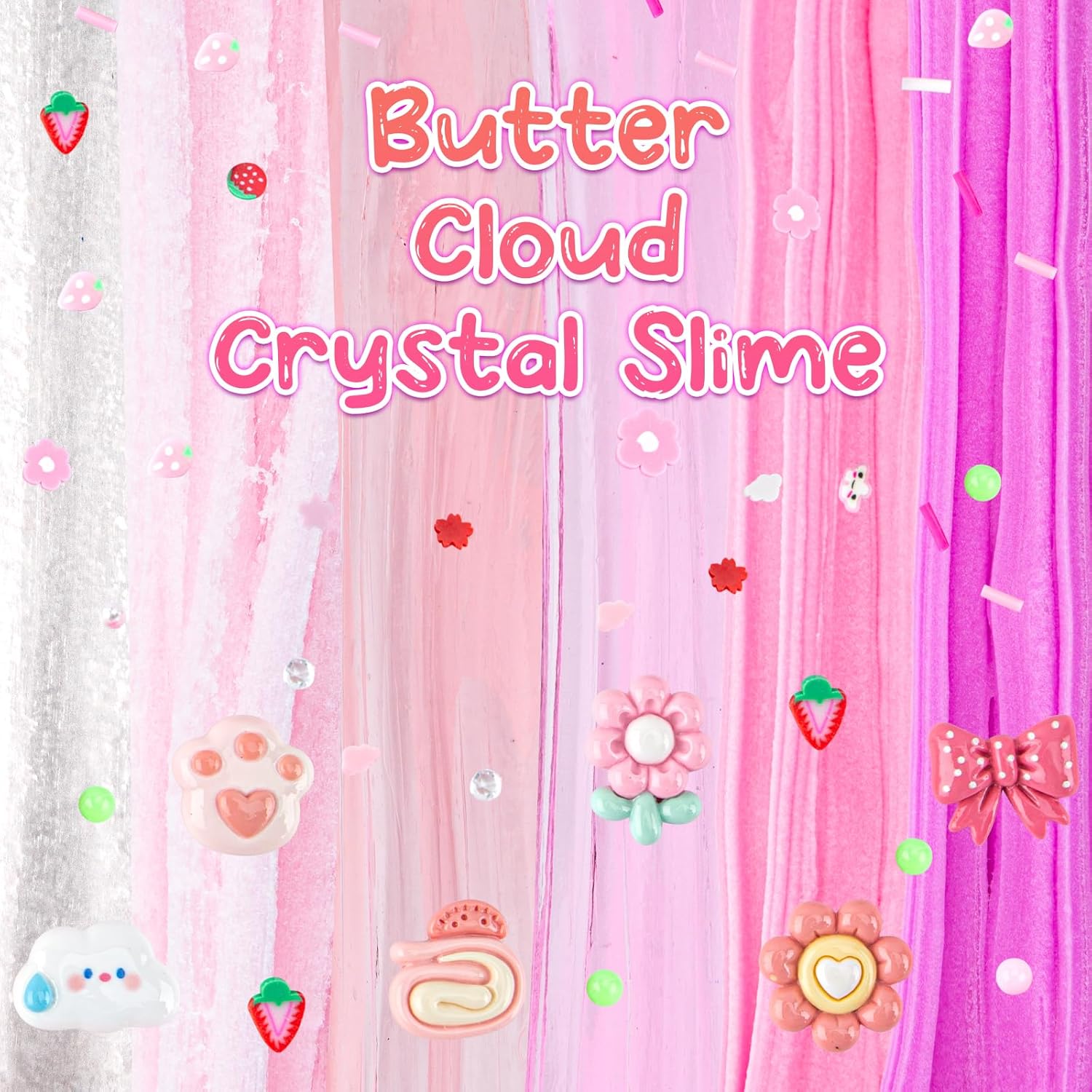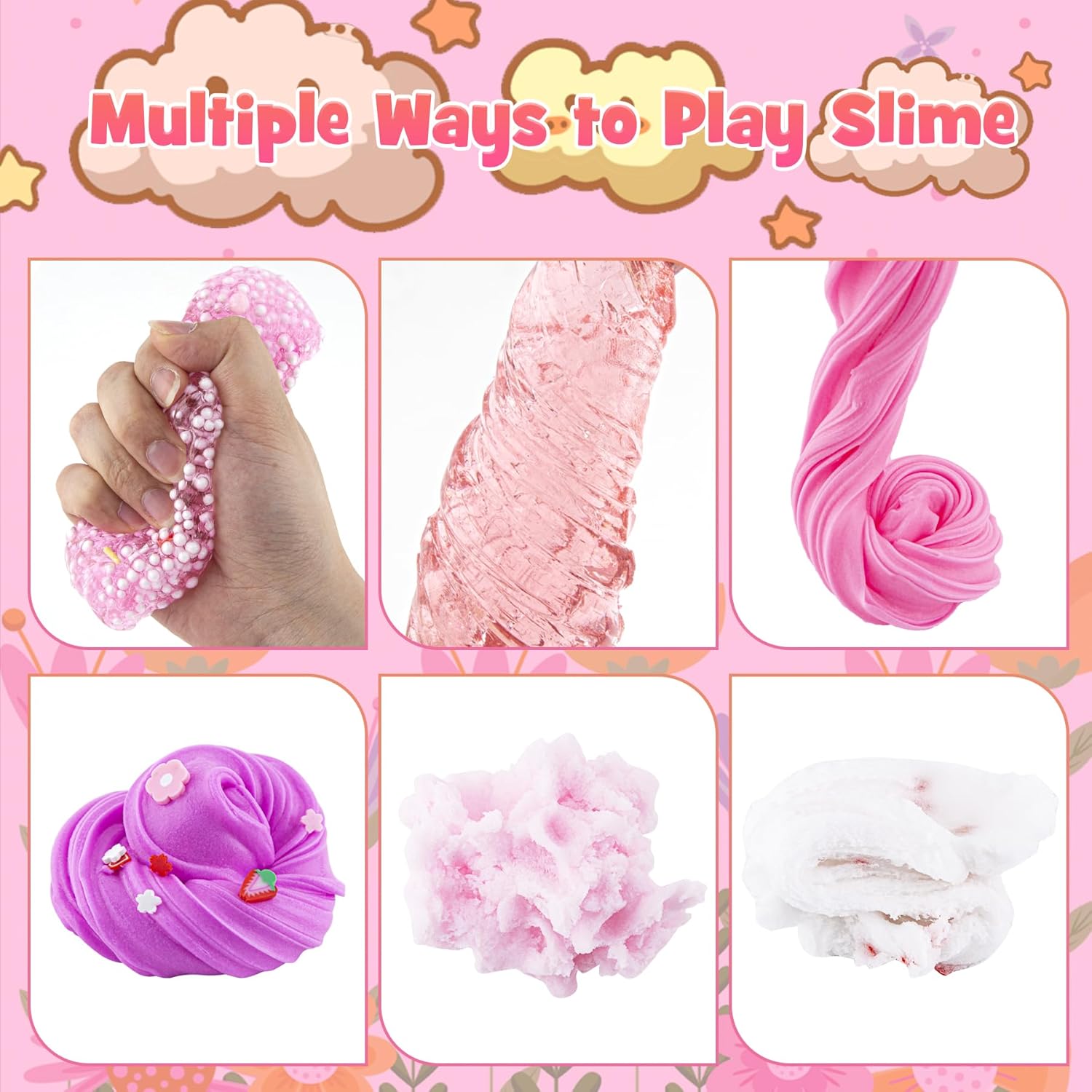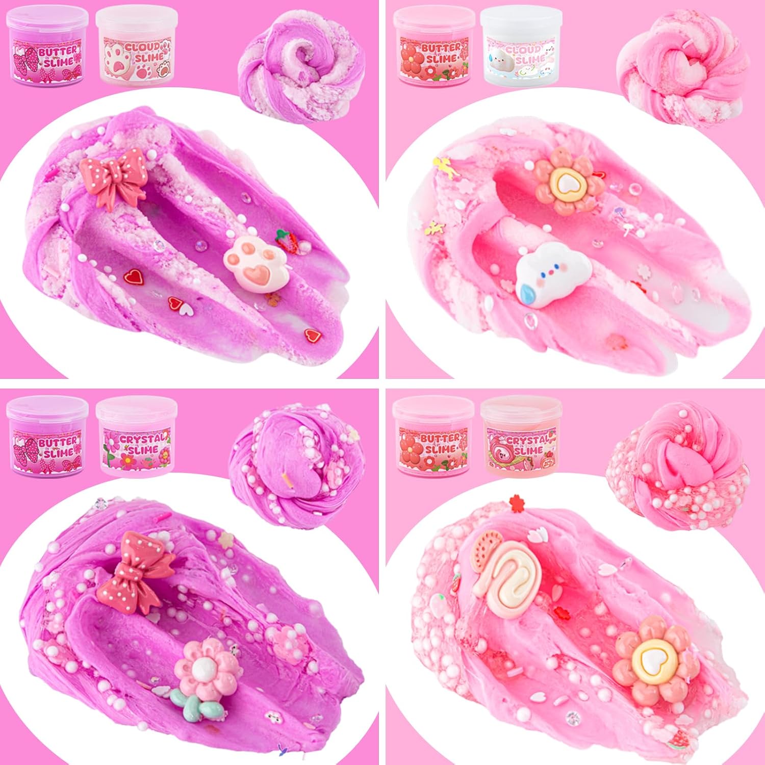 ☁️【Pink Slime Kit】Our pink slime kit includes 3 different texture of slime: 2 packs of Pink butter slime, 2 packs of Pink cloud slime and 2 packs of Pink clear crystal slime. Each container holds 60ml slime.Totally 360ml for the slime pack with charms. You can experience non-sticky butter slime, super fluffy cloud slime and flexible clear slime all at the same time!