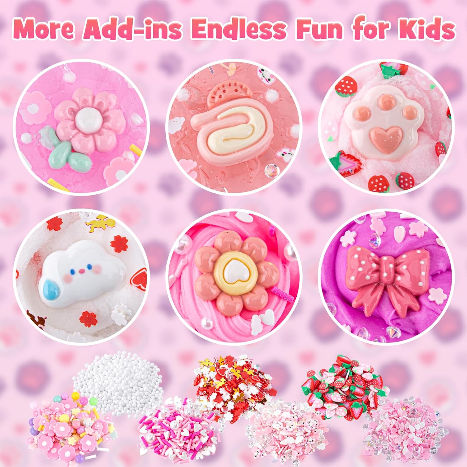 🌺【Gradual Pink & Various Add-ins】This pink slime kit is picnic themed, graduating from white to dark pink and contains 8 slime add-ins. Whether you want to make crunchy slime, fluffy snowflake slime or smooth butter slime, paired with a variety of adorable slime charms to create your own one-of-a-kind slime creations, this slime kit has everything you need.