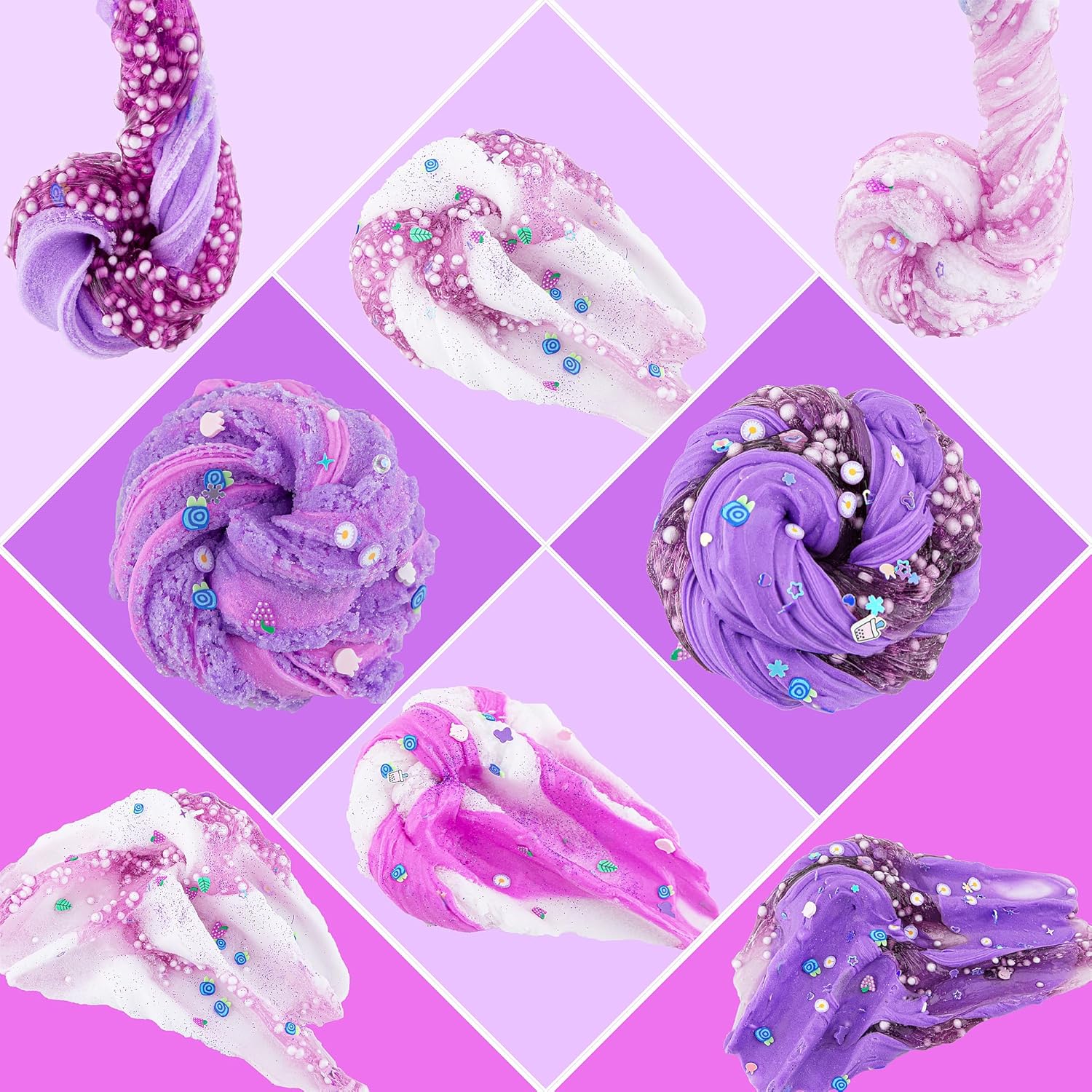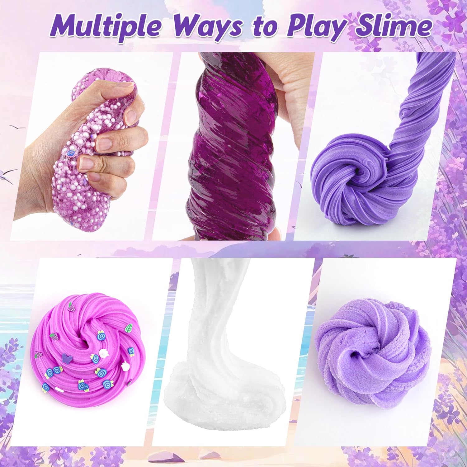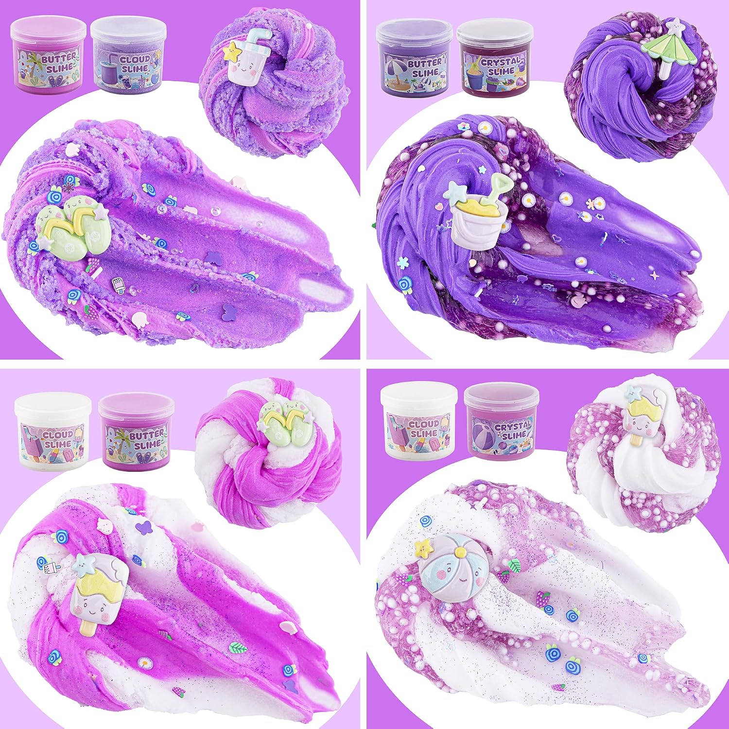 🍹【Purple Slime Kit】Our purple slime kit includes 3 different texture of slime: 2 packs of purple butter slime, 2 packs of purple cloud slime and 2 packs of purple clear crystal slime. Each container holds 60ml slime.Totally 360ml for the slime pack with charms. You can experience non-stick butter slime, super fluffy cloud slime and flexible clear slime all at the same time!