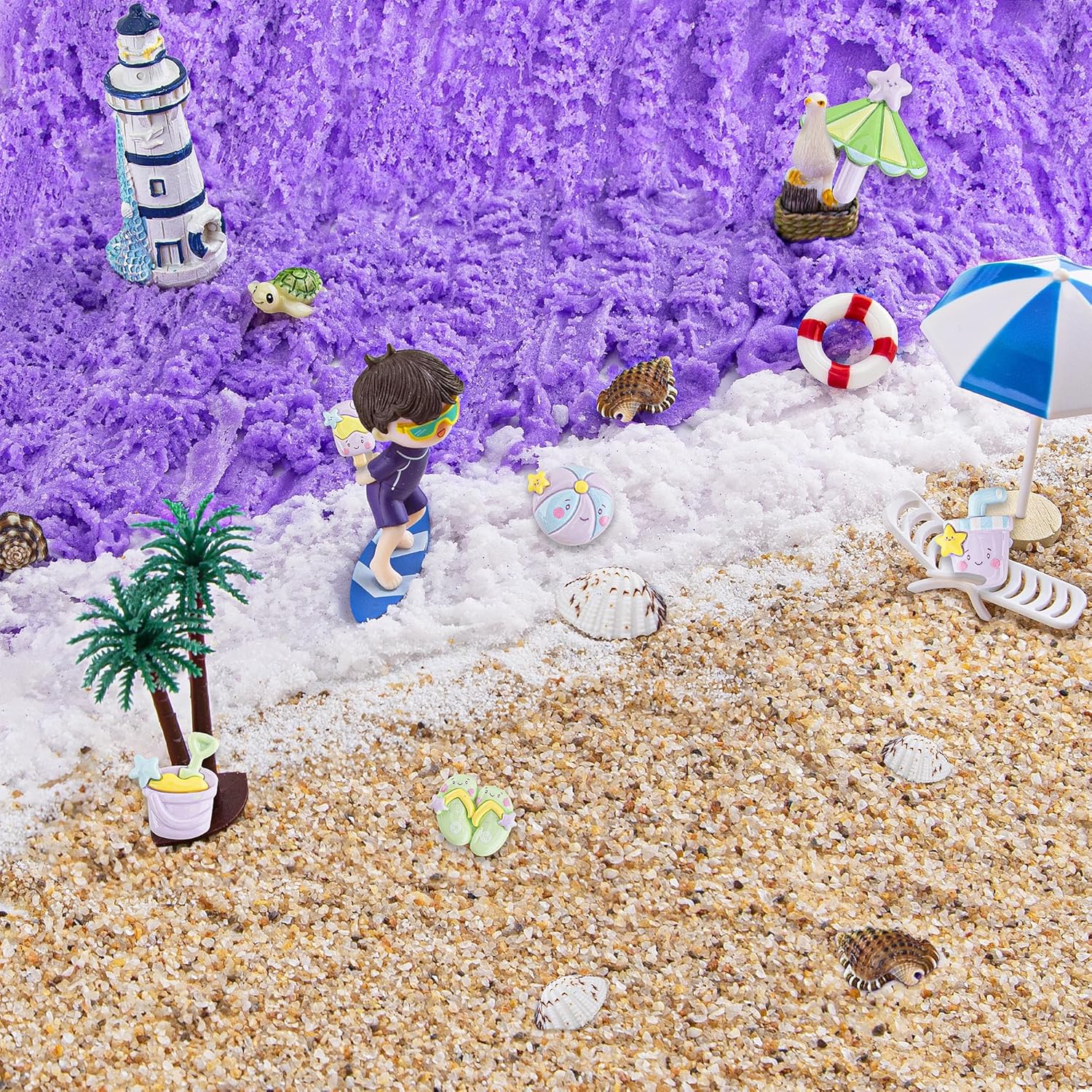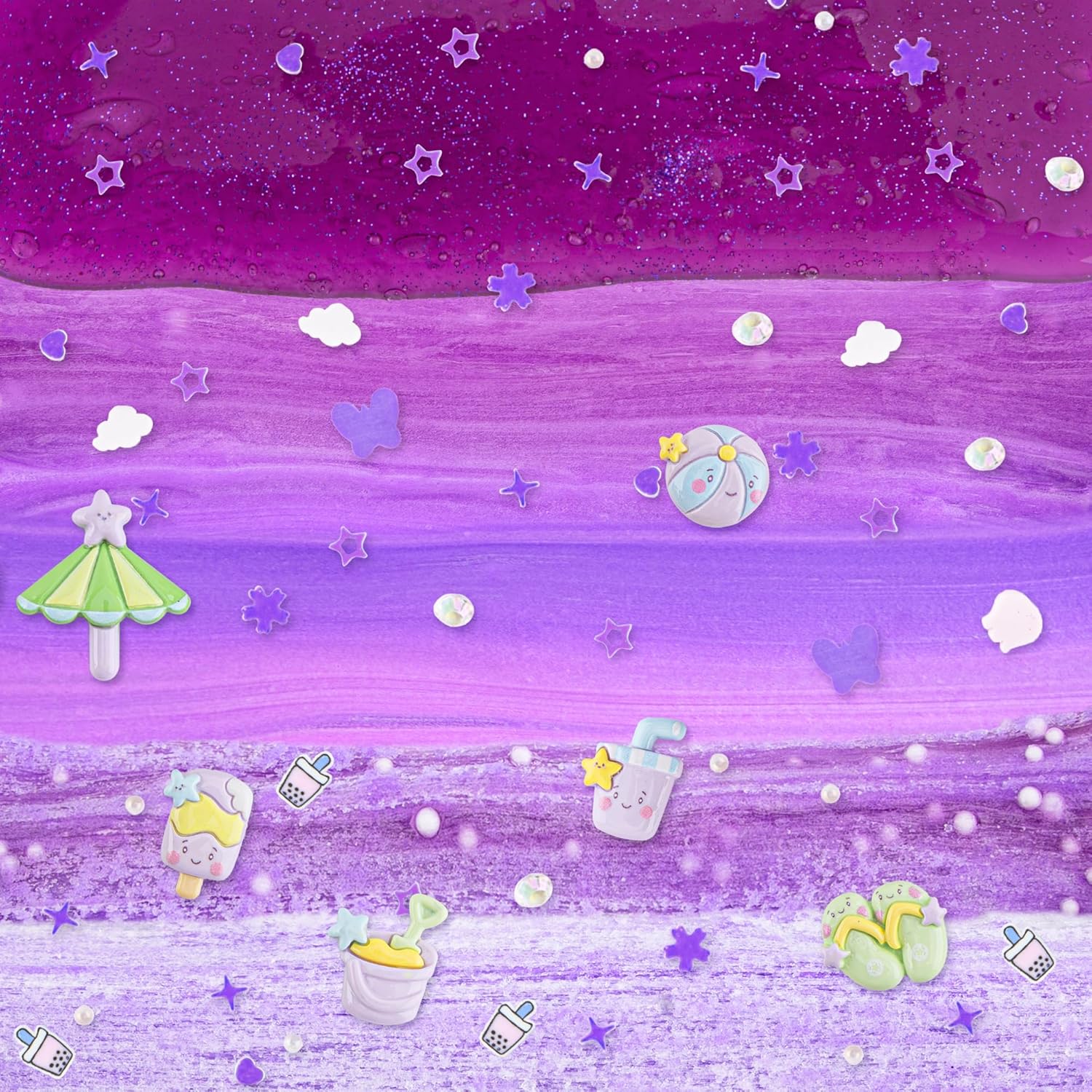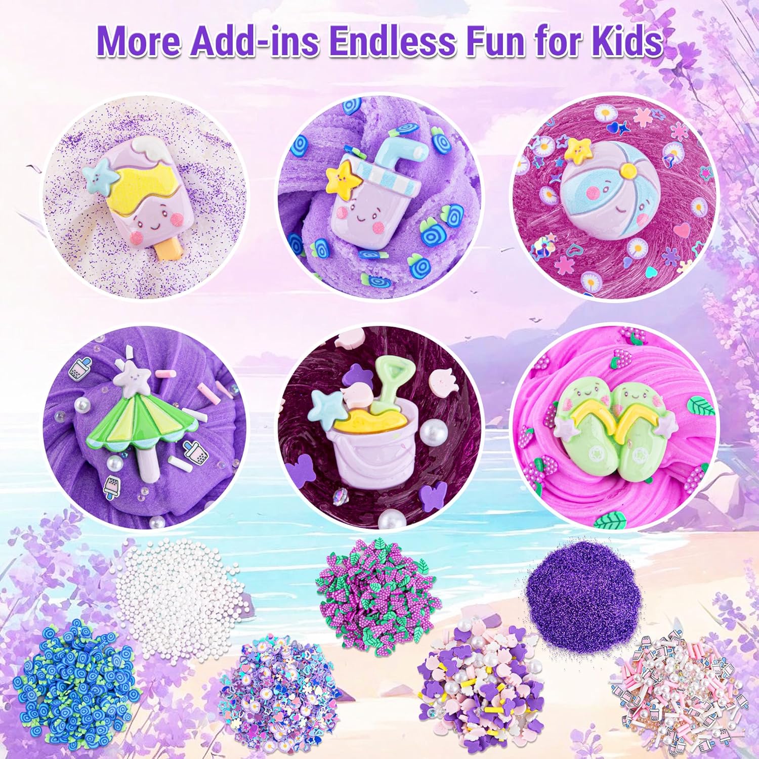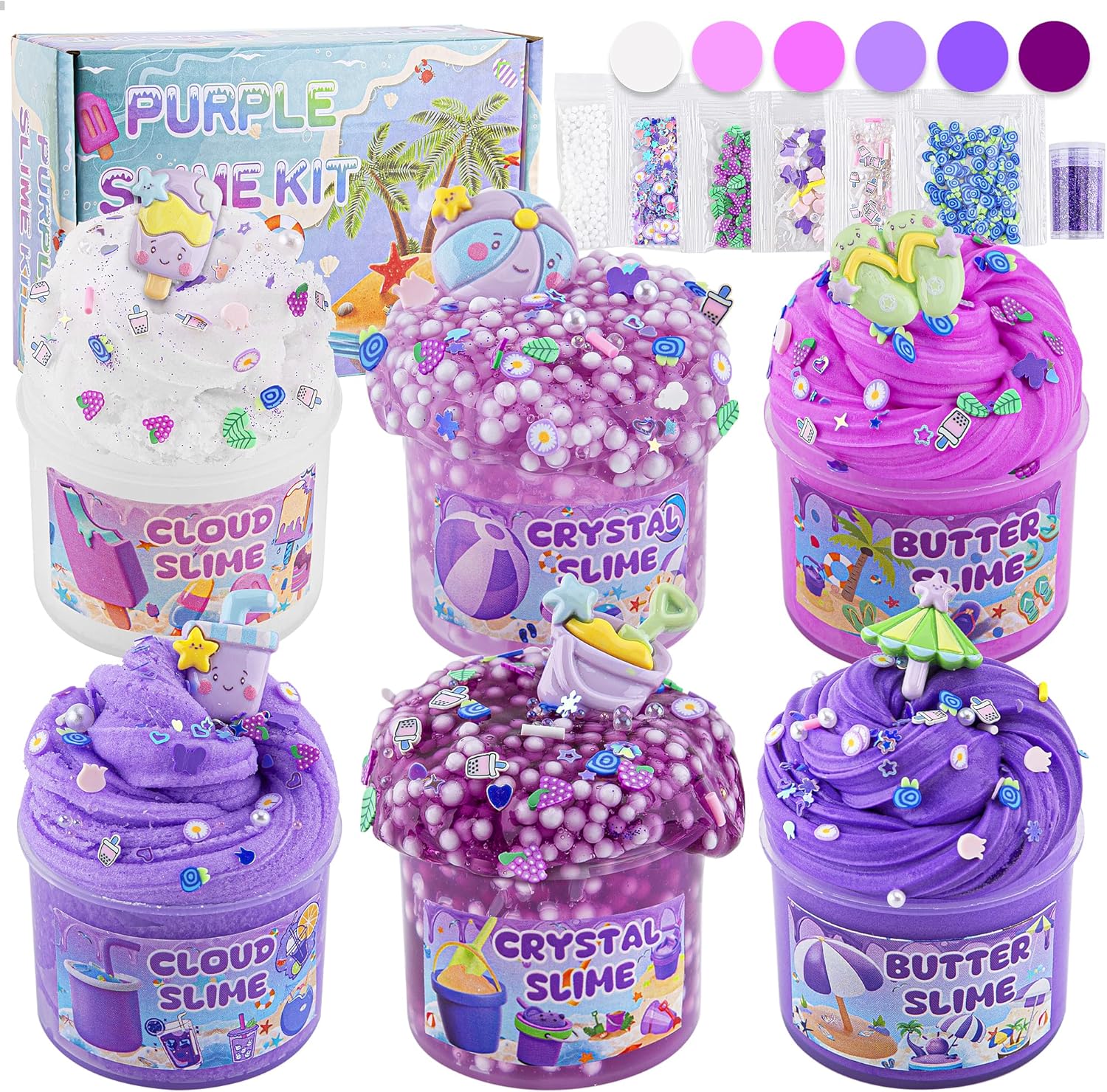 🍧【Gradual Purple & Various Add-ins】This purple slime kit is beach themed, graduating from white to dark purple and contains 8 slime add-ins. Whether you want to make crunchy slime, fluffy snowflake slime or smooth butter slime, paired with a variety of adorable slime charms to create your own one-of-a-kind slime creations, this slime kit has everything you need.