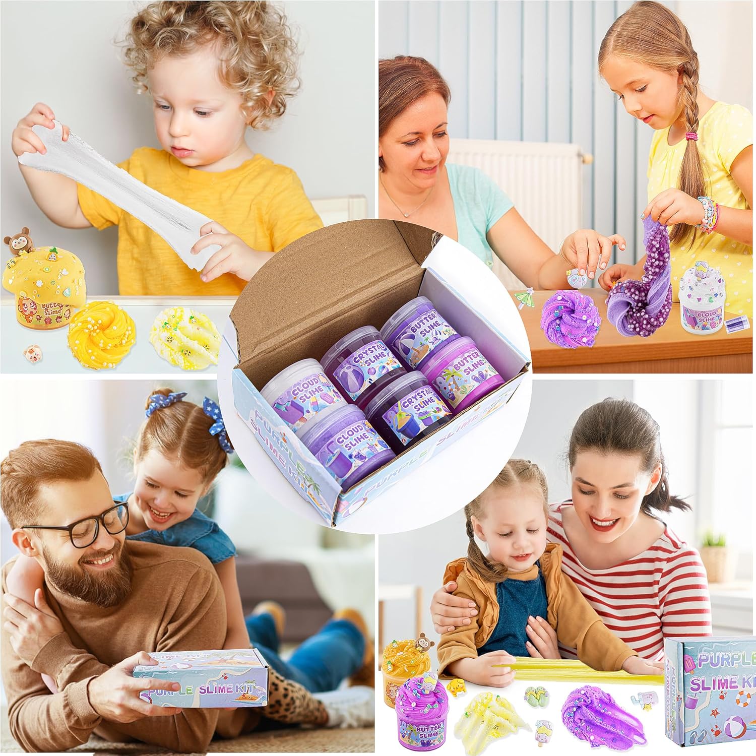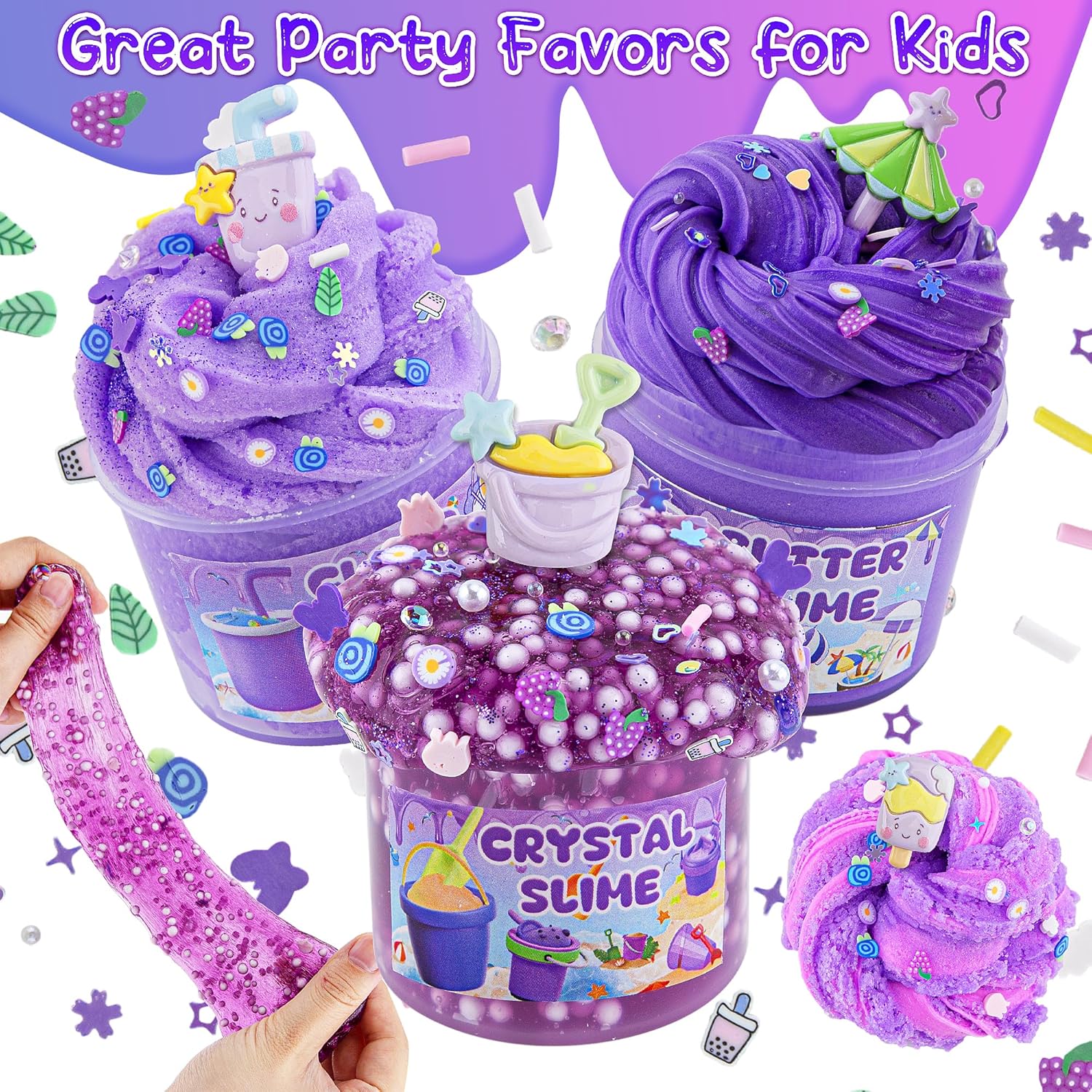 🏖️【Slime Party Favors for Kids】This 6 packs purple slime kit with a wide variety of slime add-ins and cute slime charms, it is a party favour for kids and a great gift choice for all kinds of festivals, birthdays, Christmas, Easter.