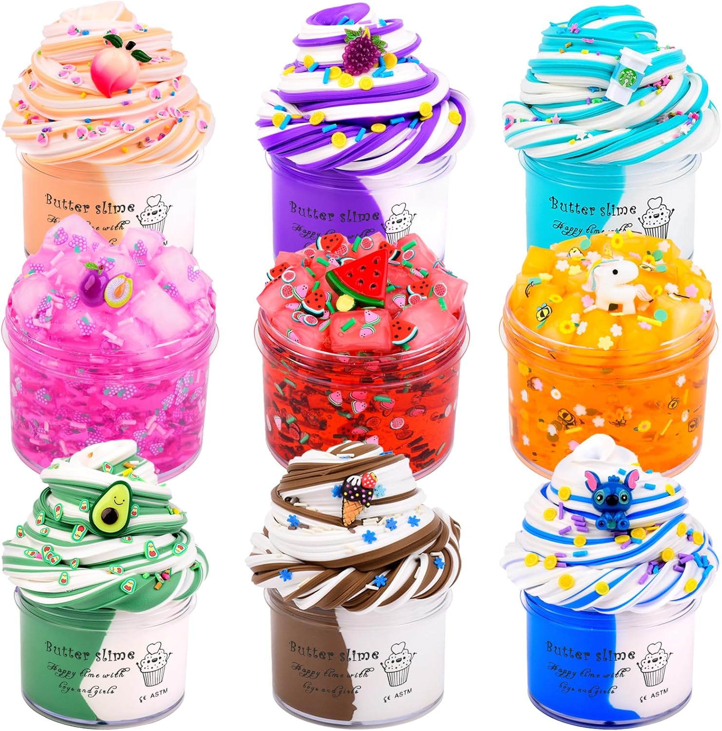 You will get 9 Pack Slime Kit, with and 3 Jelly Cube Crunchy Slime and 6 Butter Slime, adorable slime charm supplies, Let Adult and kids enjoy more DIY fun.