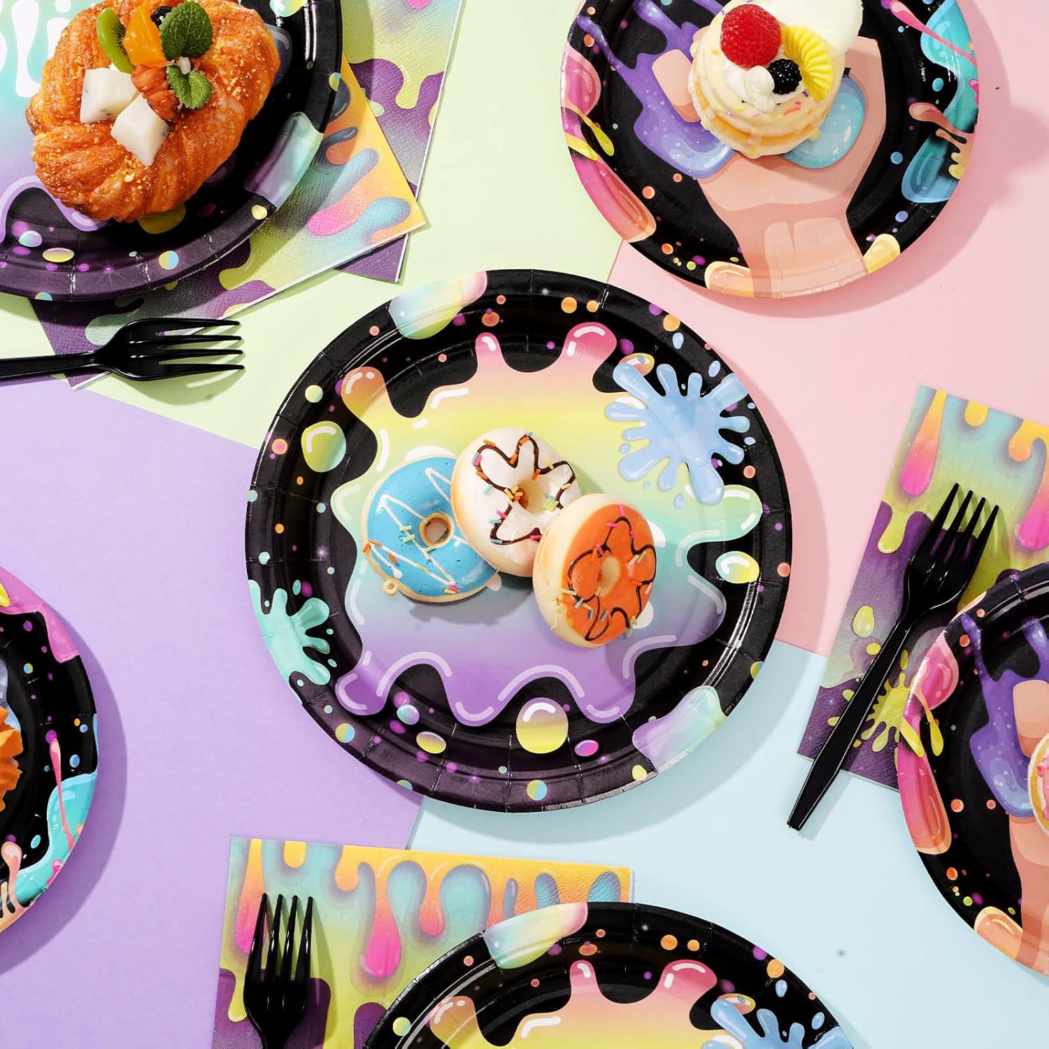 96Pcs Slime Making Party Supplies Slime Birthday Plates Napkins Forks Tableware Set Slime Party Decorations for Boys Girls Glitter Slime Splatter Splash Colorful Theme Birthday Party, Serves 24