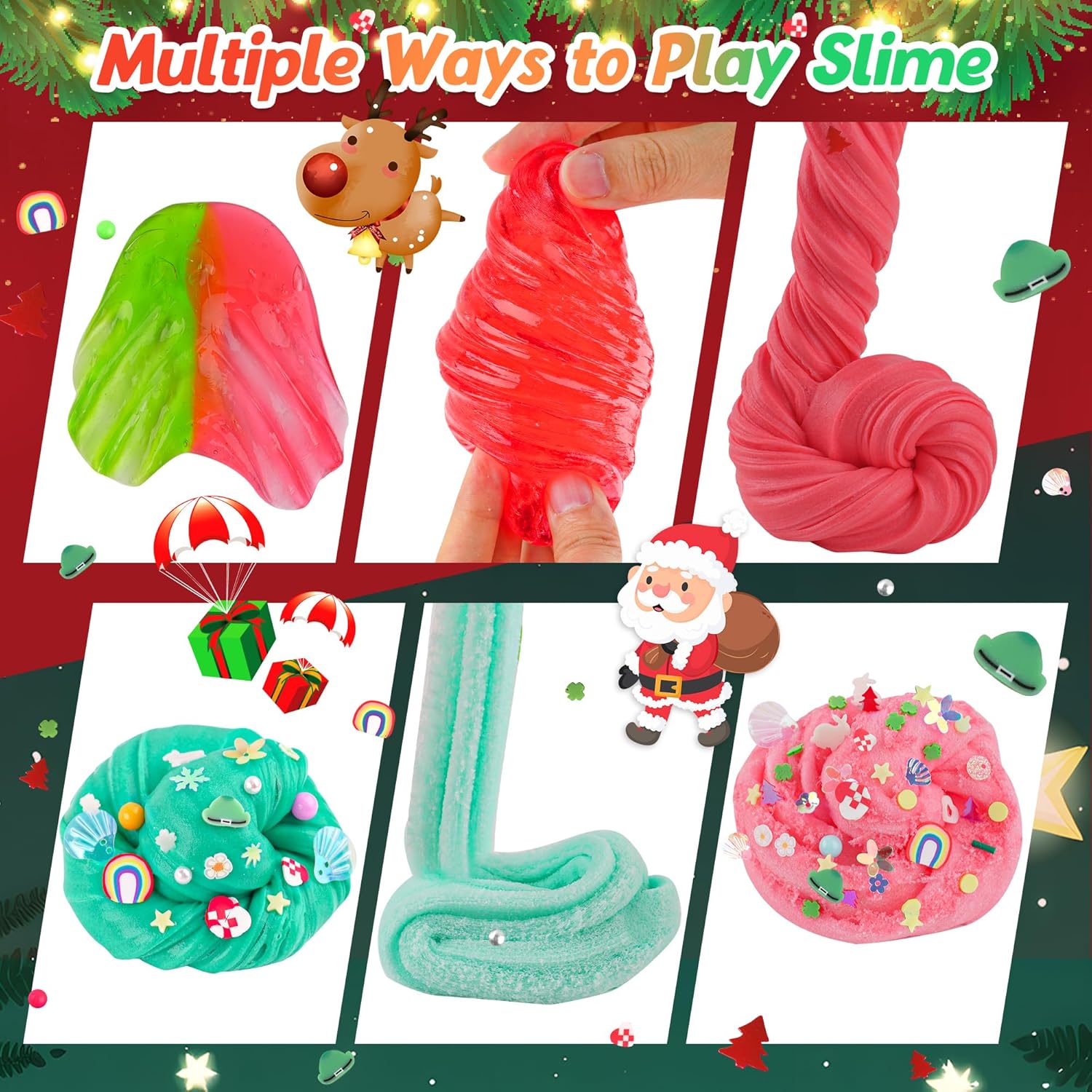 🐢【Red and Green Slime Kit】Our kids Christmas slime set includes 3 different textures of slime: 2 bottles of red and green butter slime, 2 bottles of red and green clear slime, 2 bottles of red and green cloud slime. Each container holds 60ml slime. Totally 360ml for the slime pack with glow in the dark slime charms & slices. You can experience both non-sticky butter slime, super fluffy cloud slime, transparent and easily stretchable clear slime!