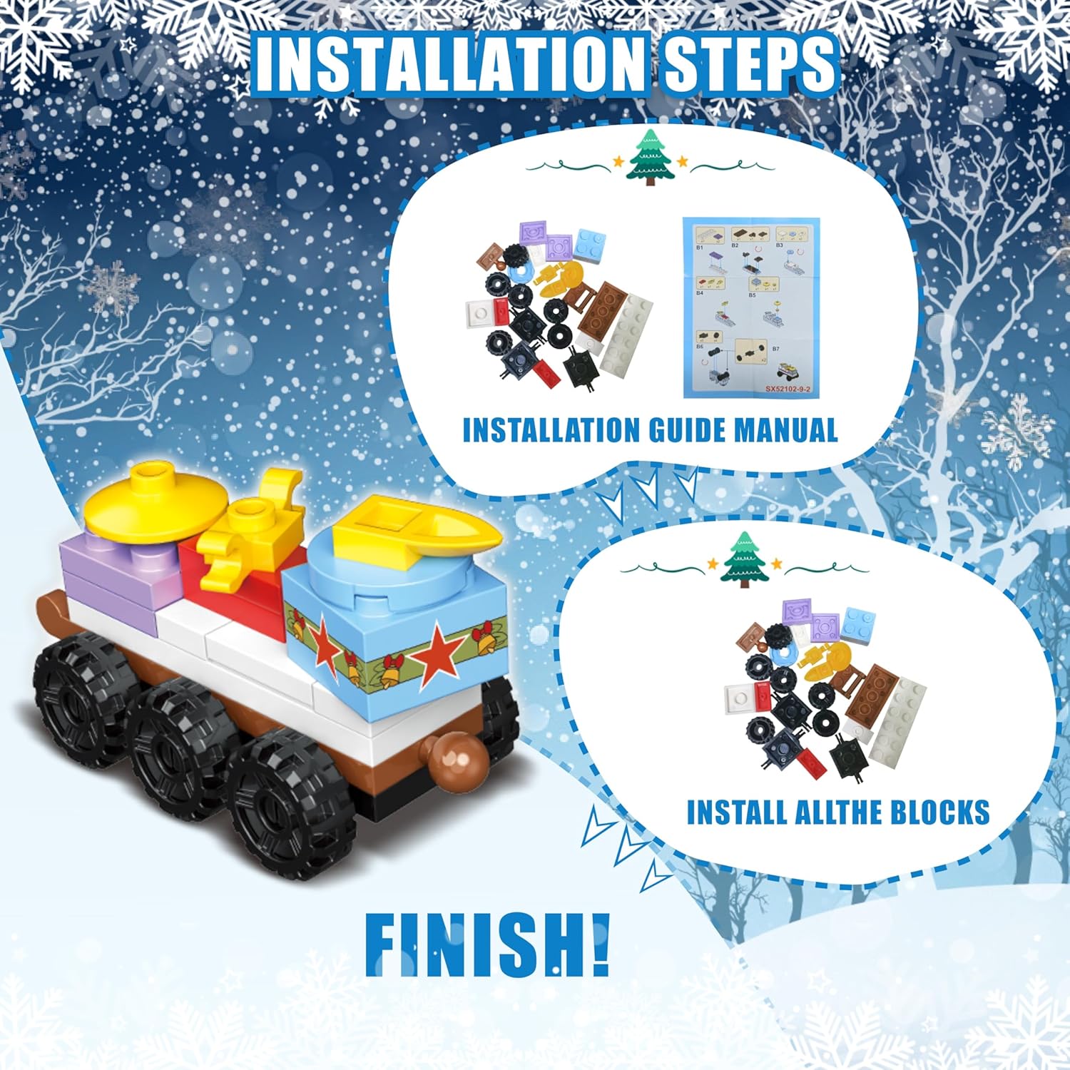 Follow the instructions, There are surprises every day, including a big Christmas tree, Christmas sleigh, Christmas scene decoration, etc.