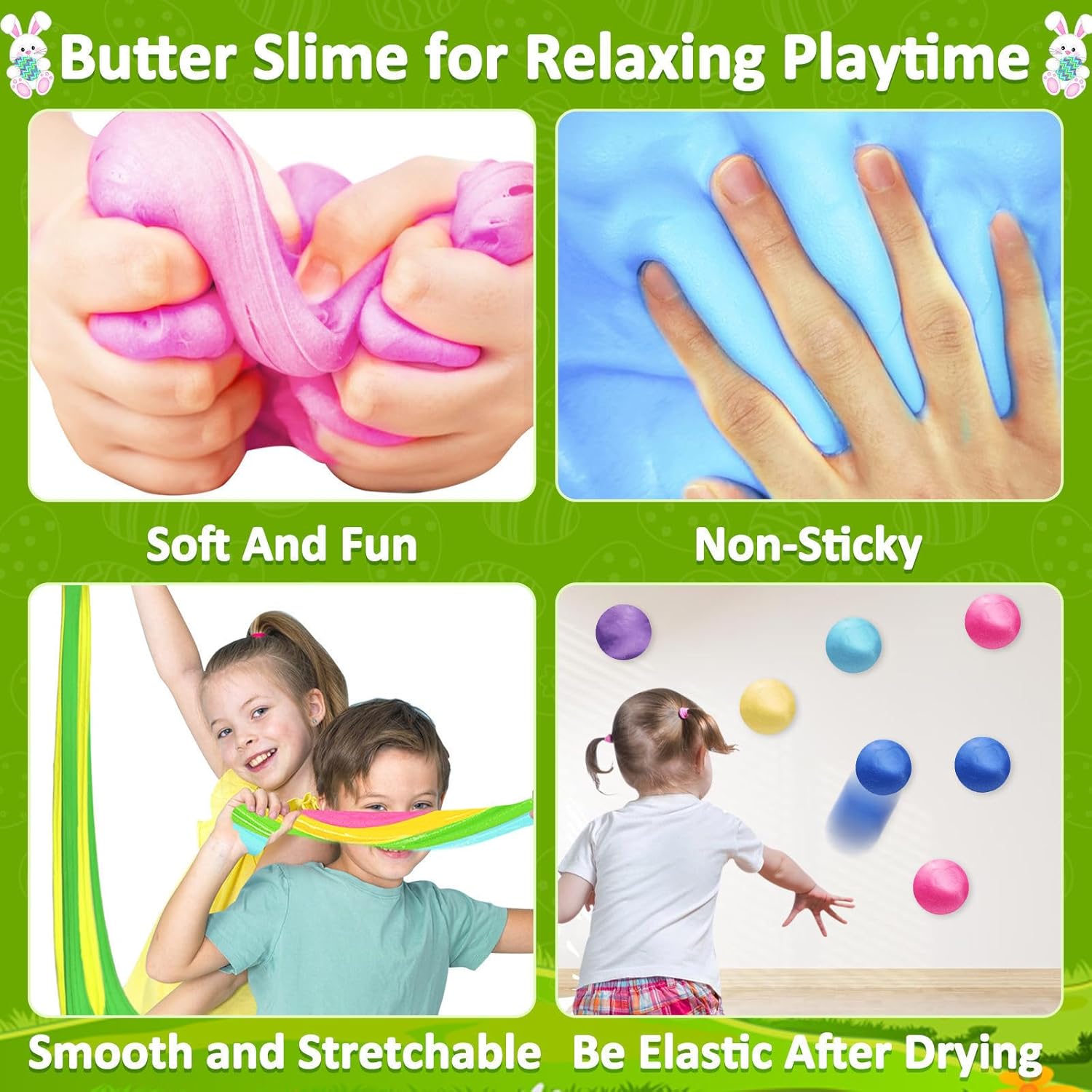 24 Pack Butter Slime Easter Eggs: Easter Basket Essential Include 24 pack 2.3 x 1.65-inch prefilled Easter eggs with soft, stretchy butter slime, offering a delightful surprise for toddlers and kids. Ideal for filling Easter baskets with fun and excitement.