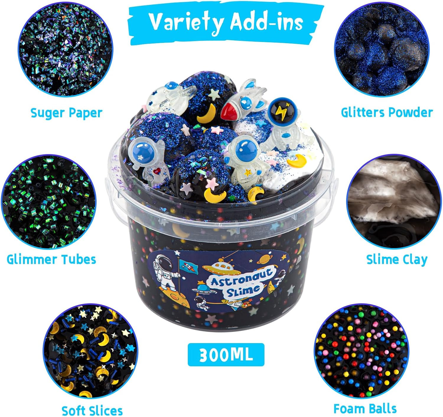 【Large Capacity & Variety Slime Add-ins】Each bucket comes packed with a generous amount of slime, containing 300ml/10 fl oz of pure joy! To enhance the fun, we have included 9 packs different slime add-ins with our slime kit. Making your own slime as Butter Slime, Crunchy Slime or Foams Slime through hands on exploration and discovery.