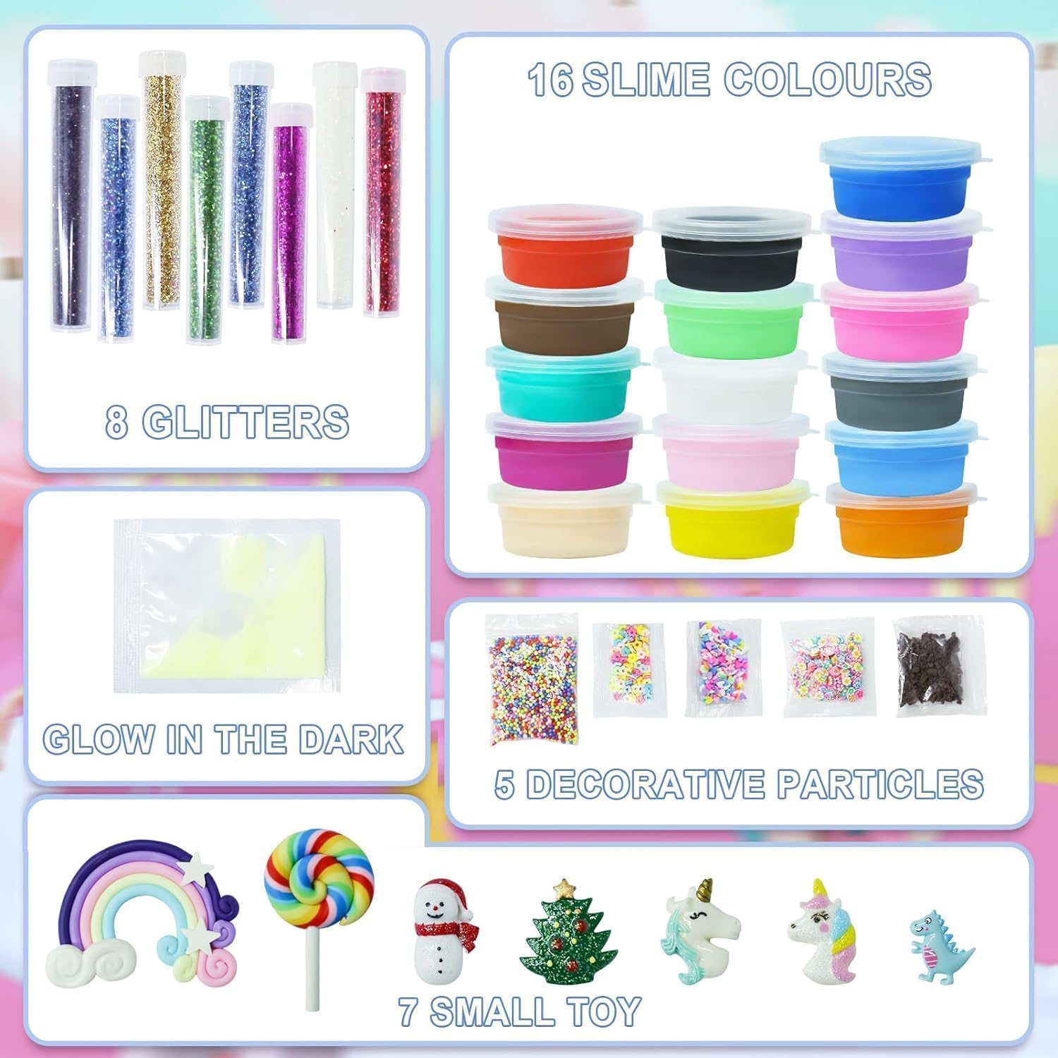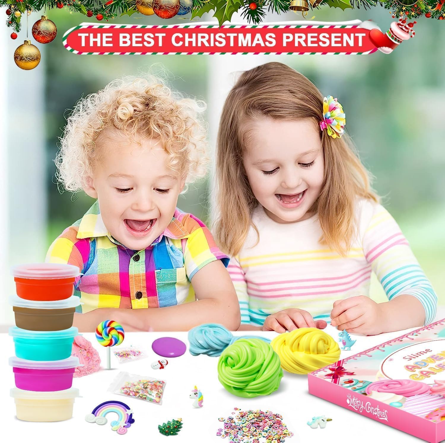 【Christmas Advent Calendar】Our Advent Calendar includes 6 Fluffy Slime and 10 Crystal Slime with different colors, 6 Glitters Tube in 2 days, 2 bag of Foam Balls,1 bag of Glow in the Dark Powder,1 bag of Fruit Slices,and 2 bag cute Soft Clay Decor(Snowman, Unicorn, Christmas tree and others).Bringing more festive and joyful atmosphere for the holiday.