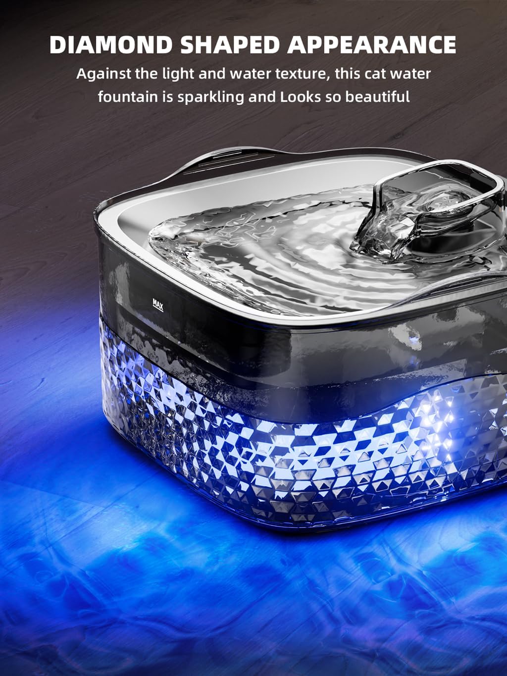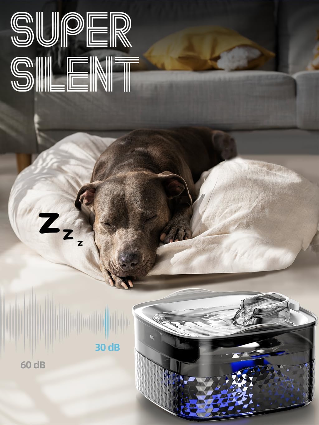 Ultra Quiet Pump: This automatic dog water fountain is equipped with an ultra-quiet pump. Lower than 30dB keep your pets healthy and hydrated without the nuisance of annoying noise.