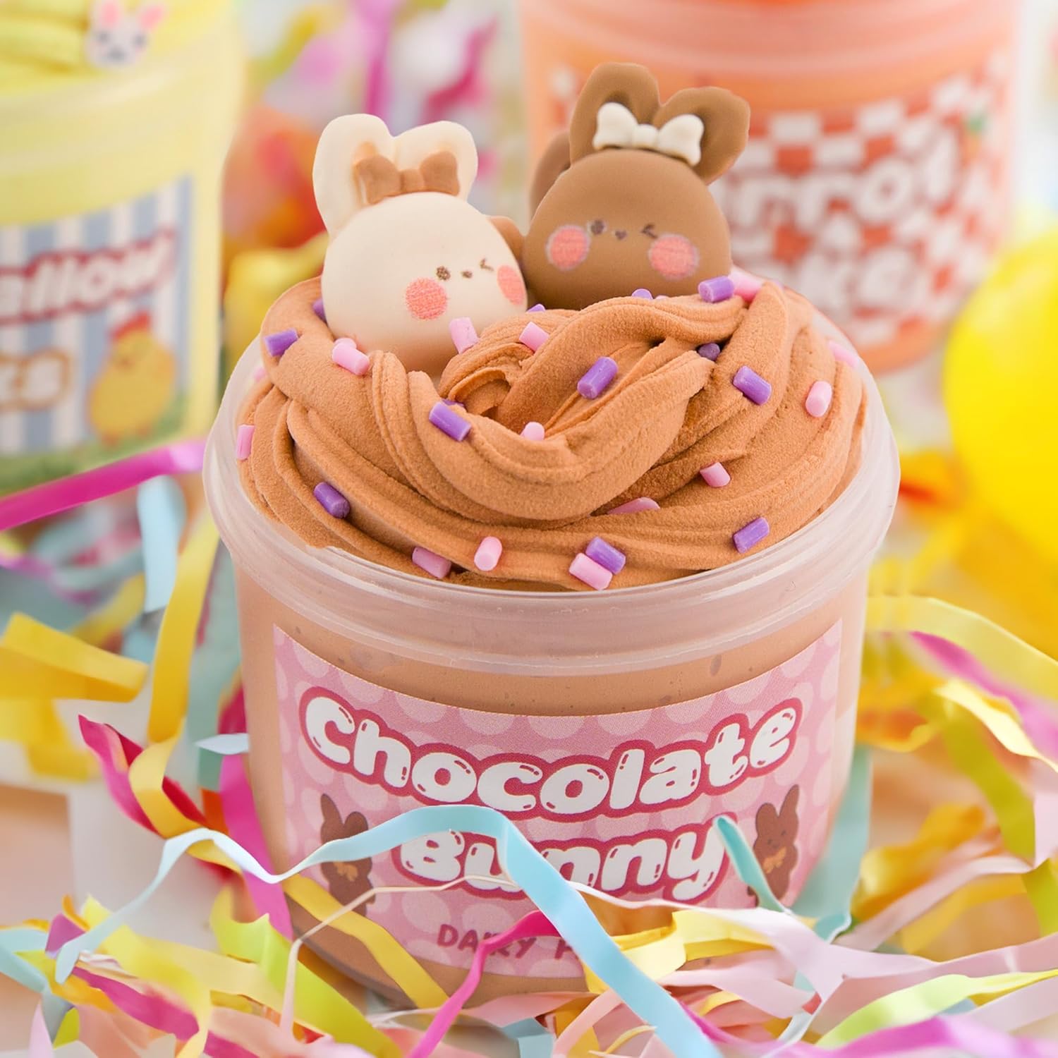 Four Fun Themes – Carrot Cake, Chocolate Bunny (the best in town!), Easter Egg Hunt, and Marshmallow Chicks. Each theme corresponds to a jar of slime, which comes with its own set of unique Easter-themed mix-ins. This provides a different surprise in every egg!