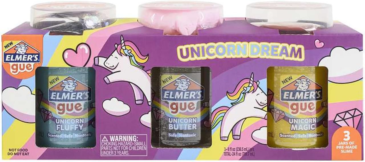 Elmer’s Gue Premade Slime, Unicorn Dream Slime Kit, Includes Fun, Unique Add-Ins, Variety Pack, 3 Count