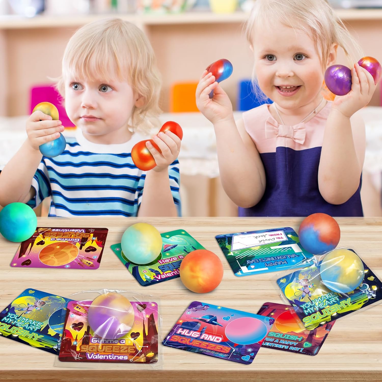 Well-Designed Valentine’s Cards For Kids :There are 6 different card styles, kids can match with slime depending on friends’ personality. Kids just need to sign on ” To ” and ” From ” , put the gift card into the bag of slime Squeeze balls kit, and hand them out to their friends of valentine’s day , It will surprise everyone that receives the gift .It is great way to encourage kids to express love,care and thanks to others .