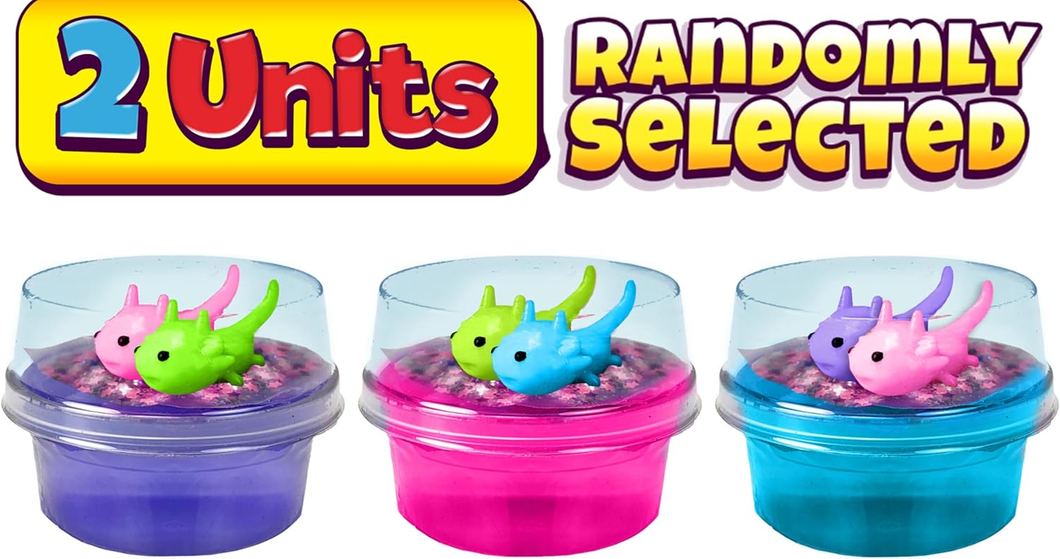2 Pack of Ugly Cute Axolotl Gel Magic – Each pack includes 1 gel-like Putty, 2 axolotl figures, star confetti, & 1 plastic cup container. Fun mini slime party favors. Slime colors may vary – Blue, Purple, or Pink Axolotl Slime.