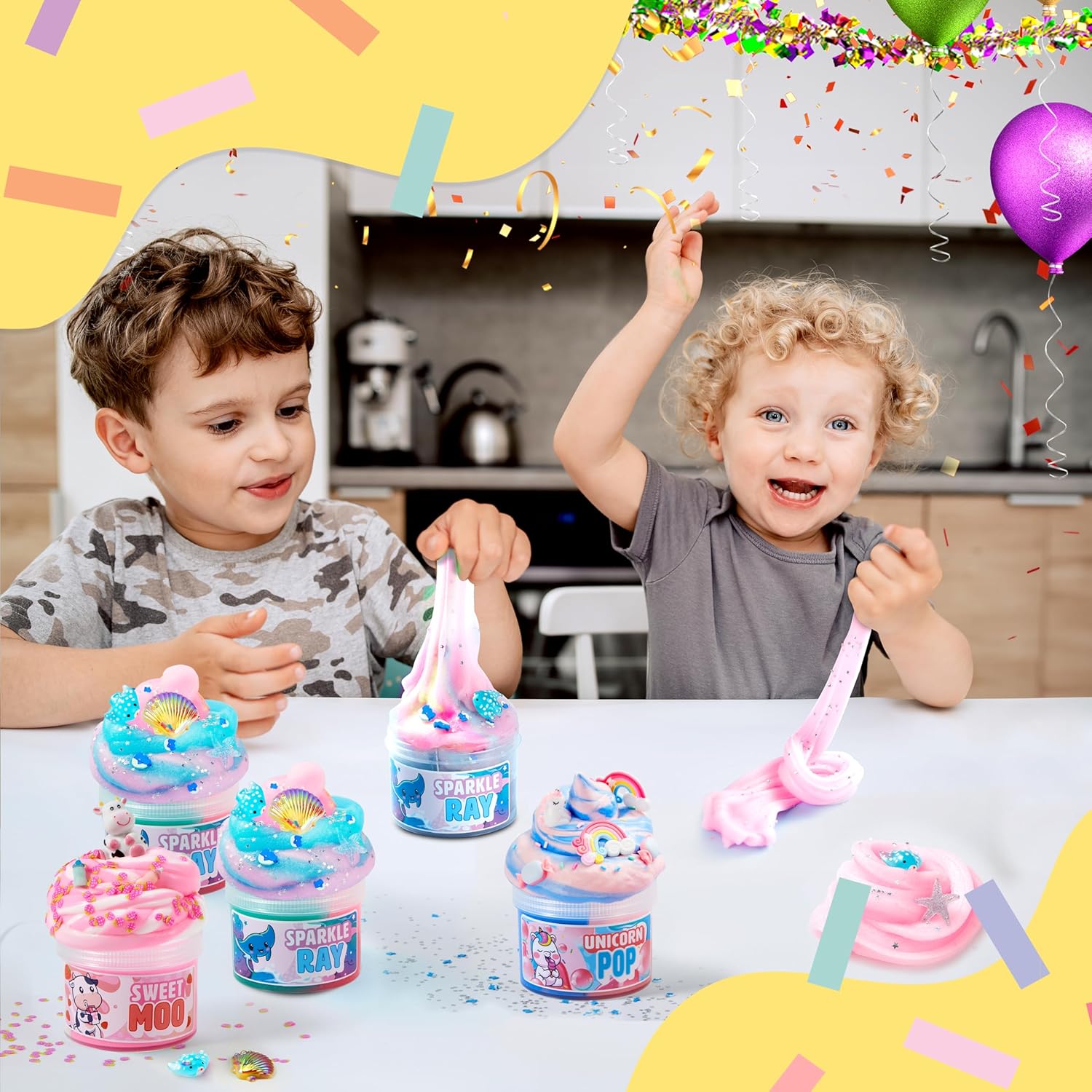 SUPER VALUE FUN: Get ready for triple the excitement! This amazing slime kit packs 3 uniquely themed butter slimes: a sweet Marshmallow Manta Ray, a magical Bubblegum Unicorn, and a delightful Strawberry Milk Cow, complete with tons of adorable accessories for endless mix-in fun SENSORY DELIGHT: Squish, squeeze, and drizzle your way to happiness! Each slime boasts a wonderfully thick, fluffy texture and yummy scents that make them perfect for satisfying sensory play and melting stress away STRETCHY & NON-STICKY : Pull, twist, and mold these super stretchy slimes! Their incredibly pliable texture is fantastic for relieving stress and anxiety, offering a calming and engaging activity for both kids and adults FUN PARTY FAVORS GIFTS: very suitable for birthday parties, valentine, easter, halloween, christmas and other gatherings, it is a must-have for parties, and can also be used as classroom treasure box toys, children’s party gifts, candy bag fillers, easter stuffers, pinata fillers, etc THREE TIMES THE PLAY: Why settle for one when you can have three fantastically themed slimes? Dive into the distinct worlds of Manta Rays, Unicorns, and Cows, sparking imaginative adventures and hours of creative, non-sticky playtime with each unique butter slime