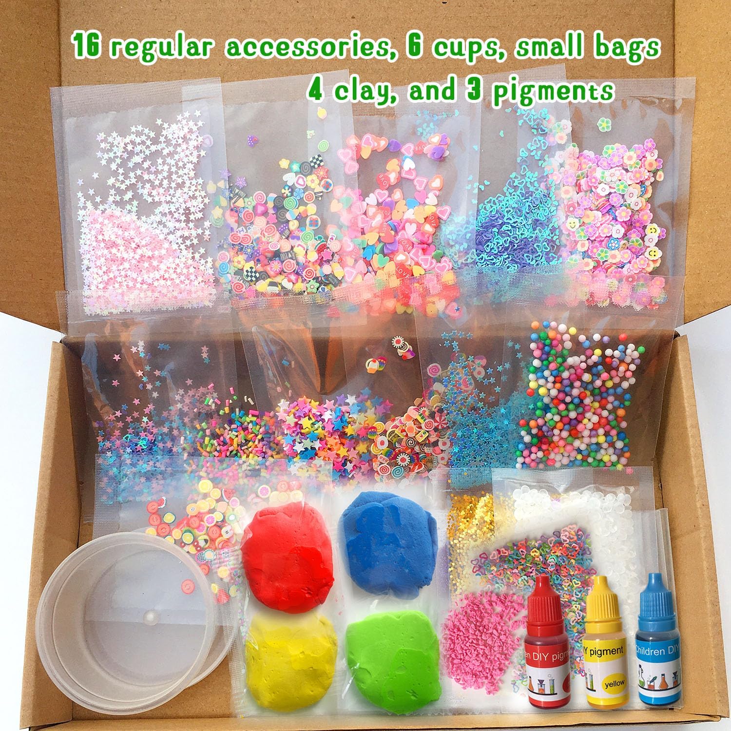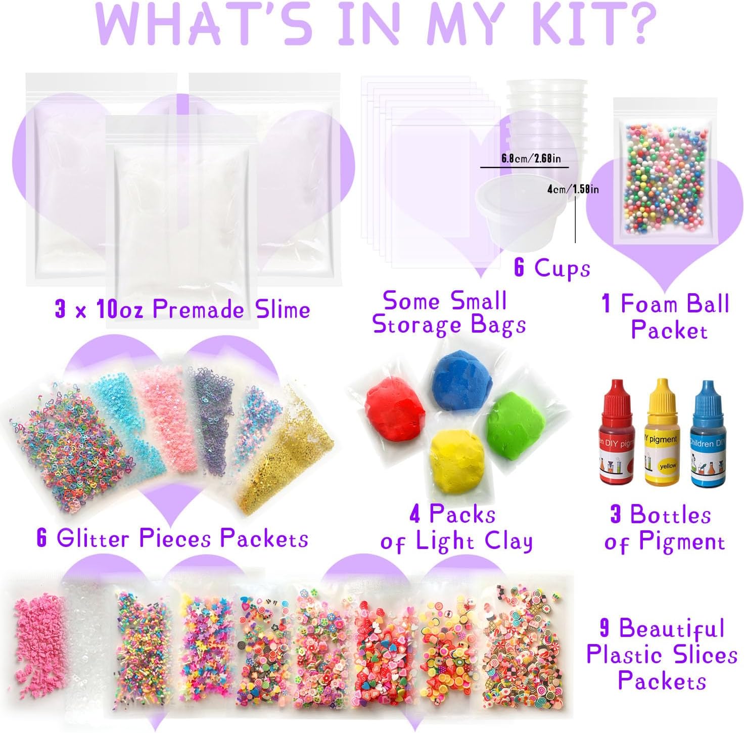 Jumbo Slime Kit – Many slime supplies : 3 bags x 10 oz Clear Slime premade putty, Some Small Storage Bags , 6 x plastic small cups for mixing colors, 1 x bag of Foam Balls, 3 Bottles of Pigment, 4 Packs of Lightweight Clay, 6 x Glitter Pieces Packets(heart-shaped Glitter,Star-Glitter,Gold-Glitter), 9 x Beautiful Plastic Slices Packets(Shaped like cake, fruit, heart, flower, chaos, stars, sugar granules, rice granules, pink chocolate chips). So many slime charms and add ins.