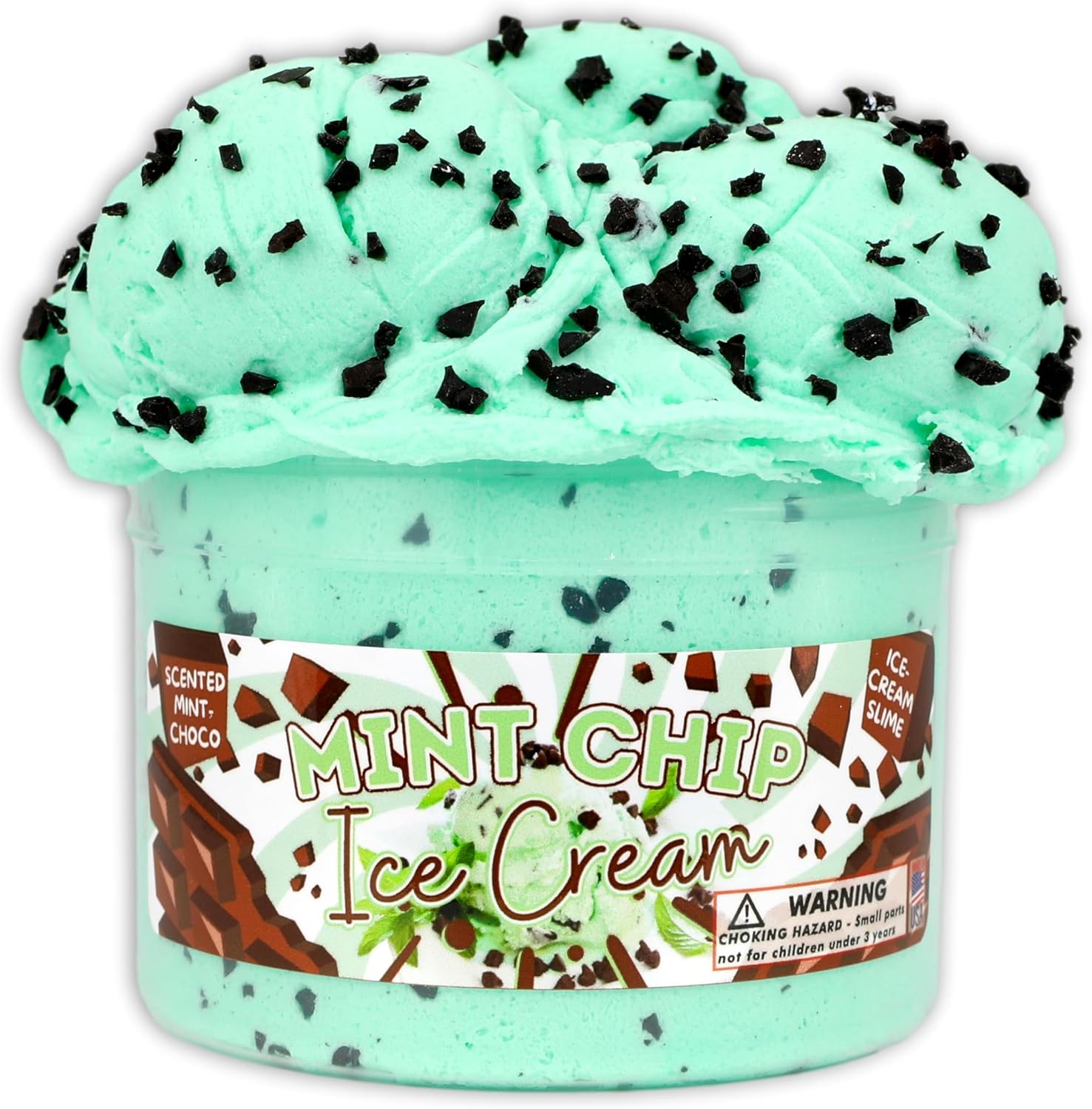 A bright turquoise ice-cream textured slime, mixed and topped with black clay chunks. Scented a blend of mint, chocolate and sweet milk.