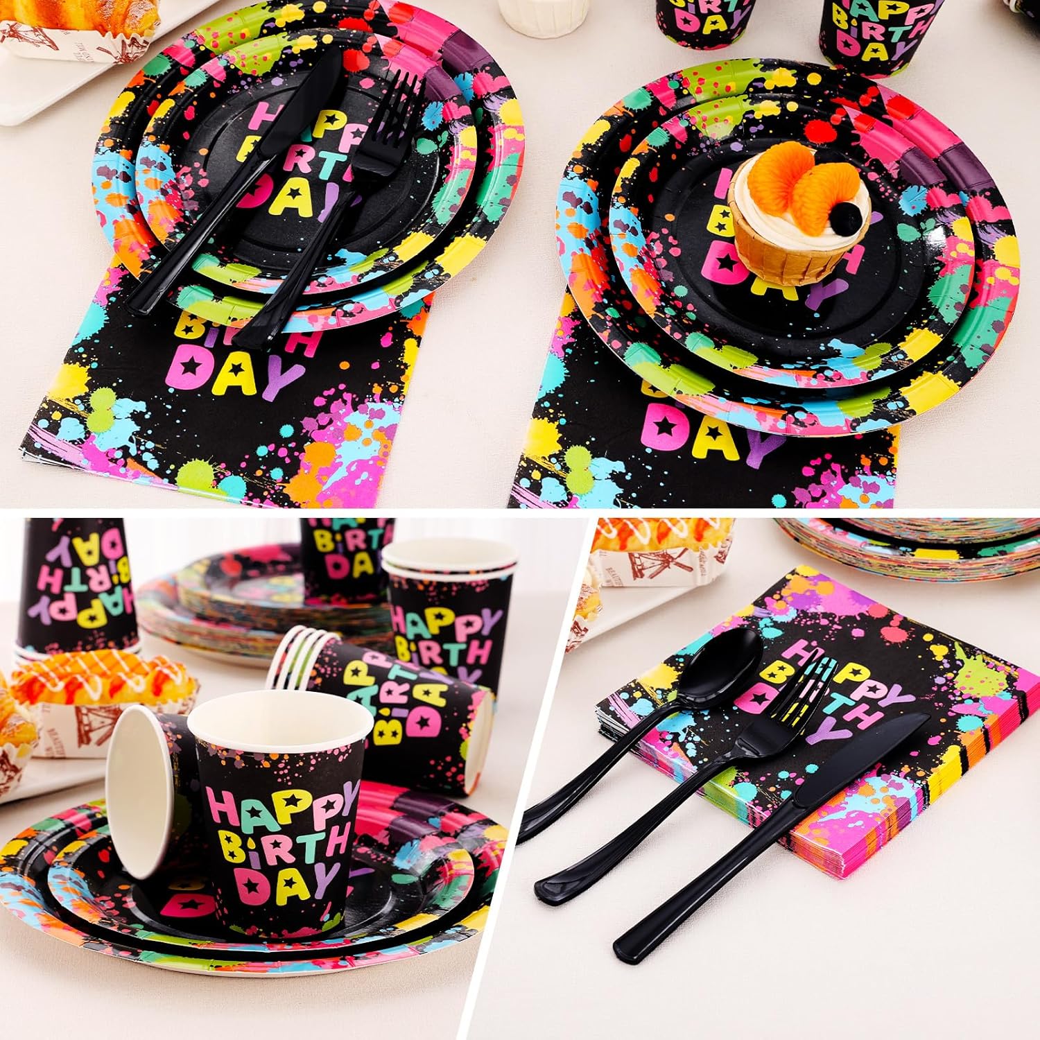 【Neon Party Supplies】Happy birthday plates and napkins party supplies includes 24 sets of black plastic cutlery(knives, forks and spoons),24pcs 7 inch neon paper plates,24pcs 9 inch neon party plates,24pcs 9oz neon cups,24pcs black and colorful paper napkins,and 1 piece neon table cloths for parties,which can add that taste of pomp and circumstance decor.