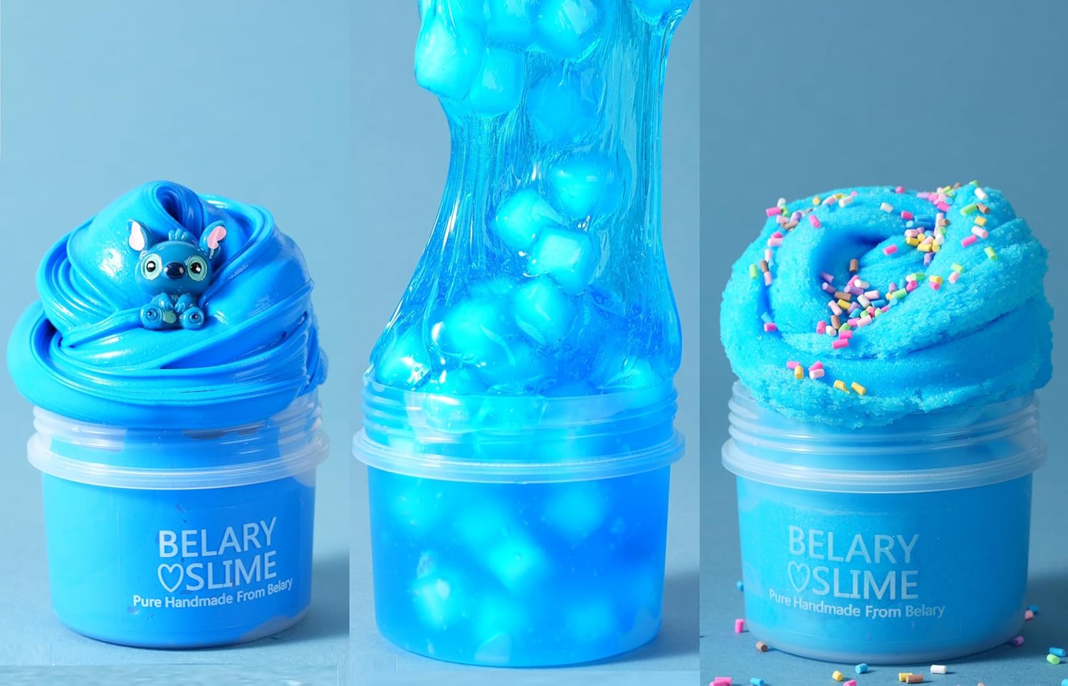 UNIQUE TEXTURE AND SENSATION: 3 different Blue slime kit, Blue clear jelly cube slime, peachybbies slime,paired with peaches, easy to grip and shape, soft and elastic. The Blue opaque and shiny crunchy slime kit, constantly stretched and squeezed hard will make a very decompression sound of frying bubbles. Blue ice slime kit, slowly stretched like a Blue snowflake, are very attractive in appearance. The design of the Blue series allows you to experience 3 different Blue slime kits at once.
