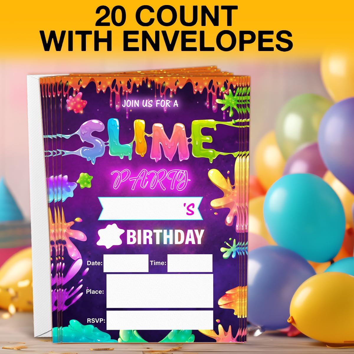 Slime Birthday Invitations With Envelopes (20 Count), Neon Glow Slime Birthday Party Fill in Invites Cards, Double Sided Design