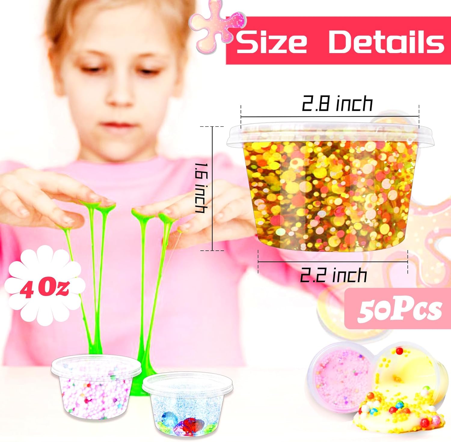 Set of 50 clear round plastic containers with lids,4 oz capacity each,ideal for organizing pigments,beads,spices,biscuits,slime,sauces,liquids,etc.They are clear and easy to clean.Enjoy making slime with family and friends.