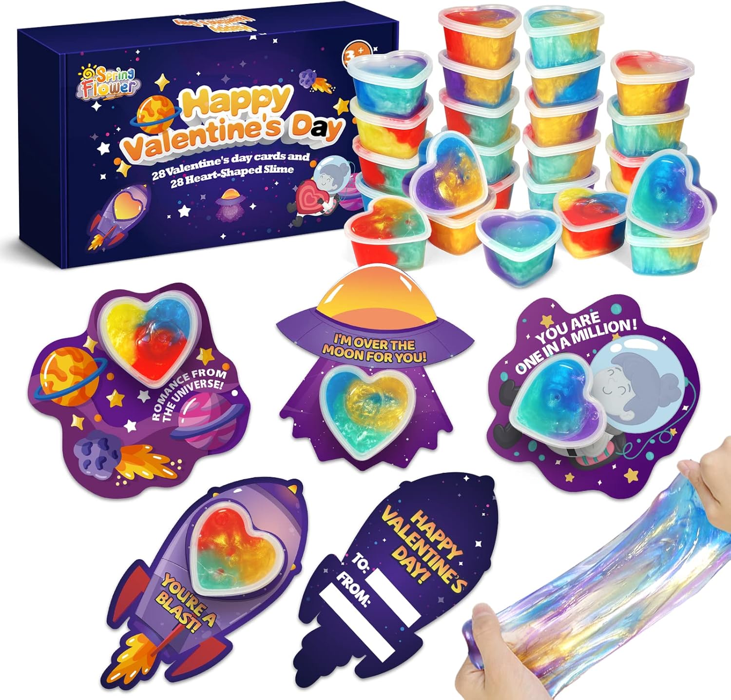 HAPPY VALEN-SLIMES DAY! Package includes 28 Valentine’s exchange cards and 28 heart shape galaxy slime in 7 different colors. Each can of heart-shaped slime comes in a blend of three colors. A unique combination of colors that kids and teens will love. This set let your kid give more than a normal card.