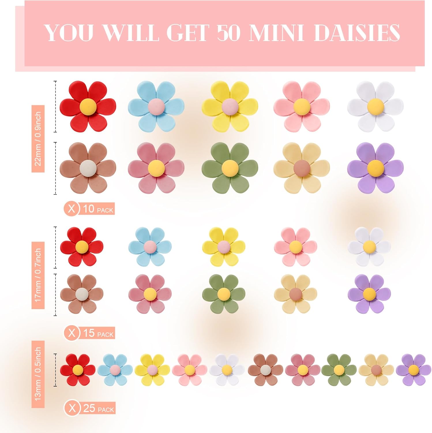 Various Sizes: these daisy flower resin charms are designed in different sizes, including 25 pieces of 0.79 inches/ 20 mm, 15 pieces of 1.02 inches/ 26 mm and 10 pieces of 1.34 inches/ 34 mm; The gradient sizes are like naturally grown flowers; You can match or mix them according to your preferences